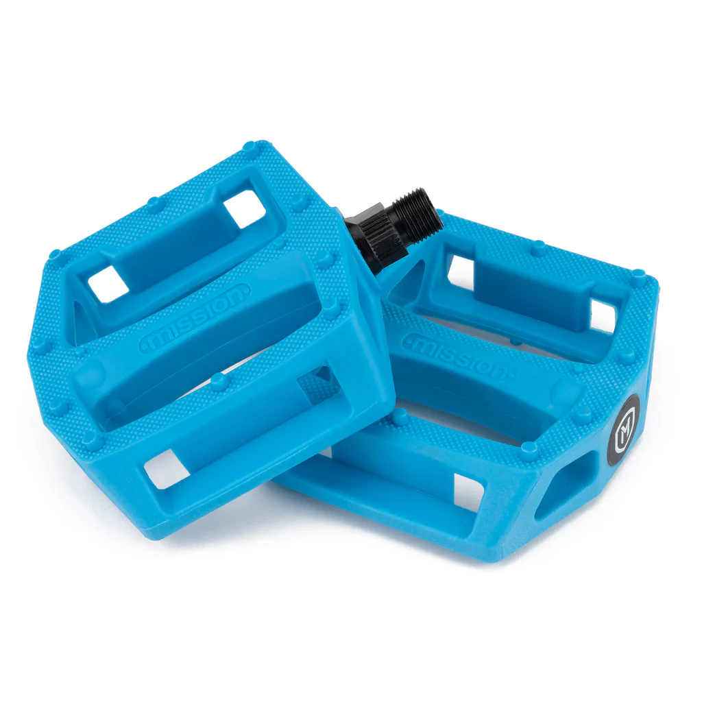 Классические пластиковые педали. Обладают высокой прочностью и надежностью. Широкая платформа сделана из нейлона и стекловолокна. Ось из хромомолибдена. С каждой стороны расположено 10 шипов, что в сочетании с накаткой платформы дает хорошее сцепление.
