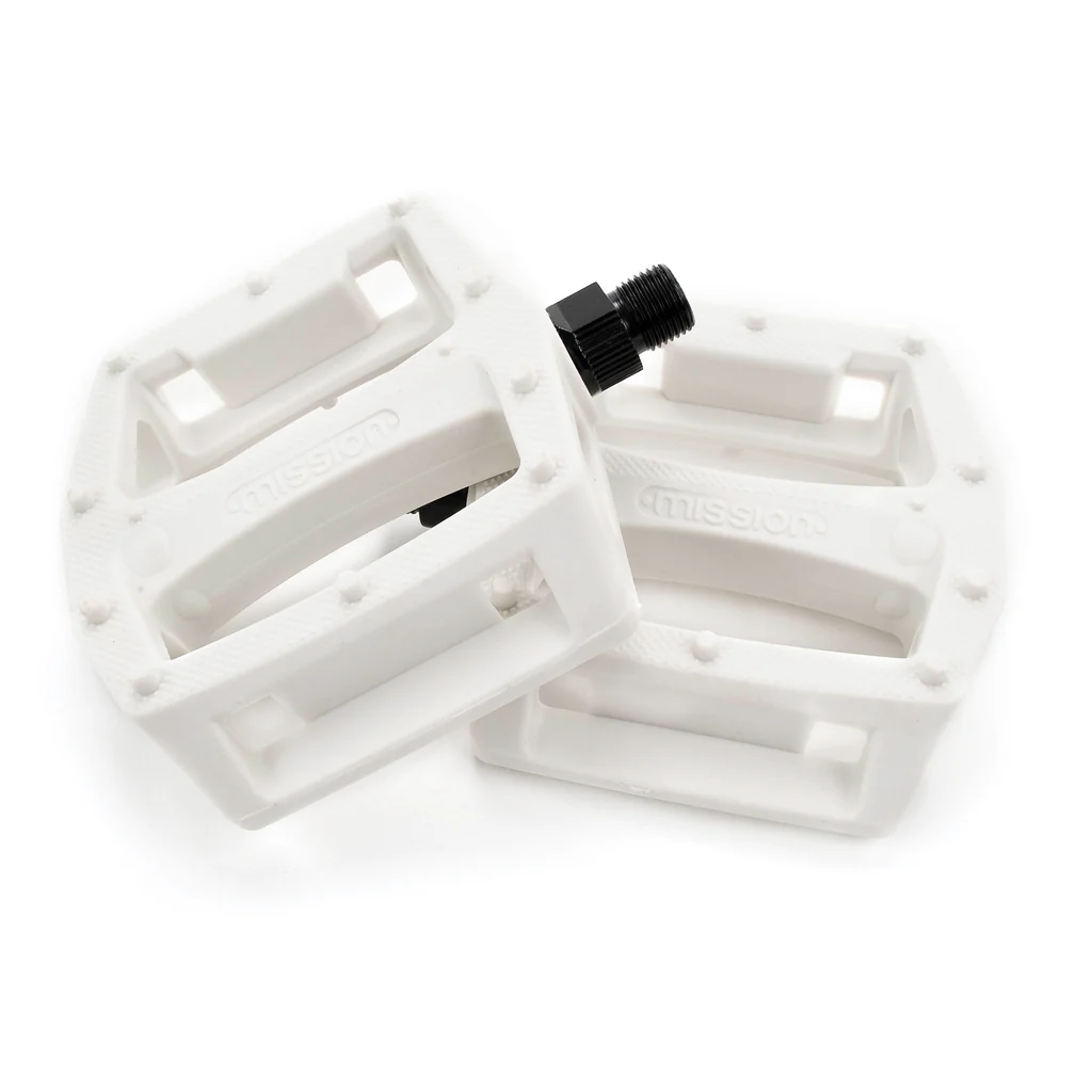 Классические пластиковые педали. Обладают высокой прочностью и надежностью. Широкая платформа сделана из нейлона и стекловолокна. Ось из хромомолибдена. С каждой стороны расположено 10 шипов, что в сочетании с накаткой платформы дает хорошее сцепление.