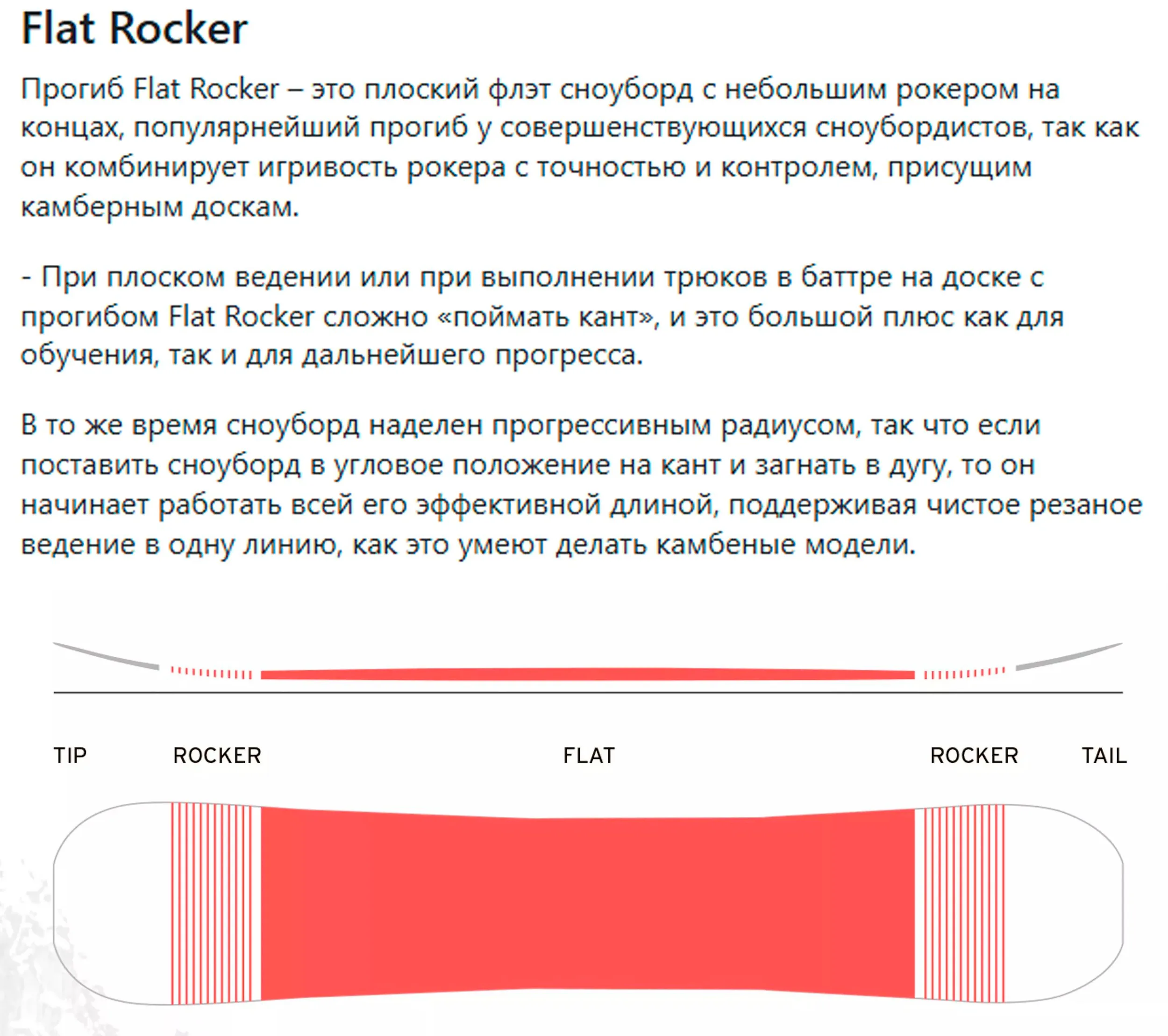• Прогиб флет (Flat), а точнее отсутствие какого-либо сильного прогиба, делает освоение азов сноубординга проще и безопаснее.